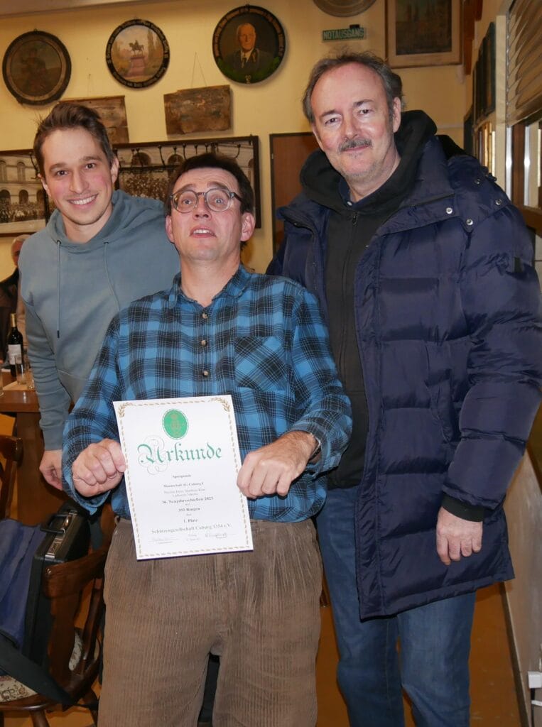 Sportpistole: 1. SG-Coburg (Nicolas Hein, Ljubomir Nikolic und Matthias Klar) 392, 2. SG-Coburg 2 (Detlef Beil, Udo Franz und Stefan Jepp) 326, 3. SG-Coburg4 (Ulrich Jacob, Robert Jacob-Bohla und Stefanie Jepp) 273