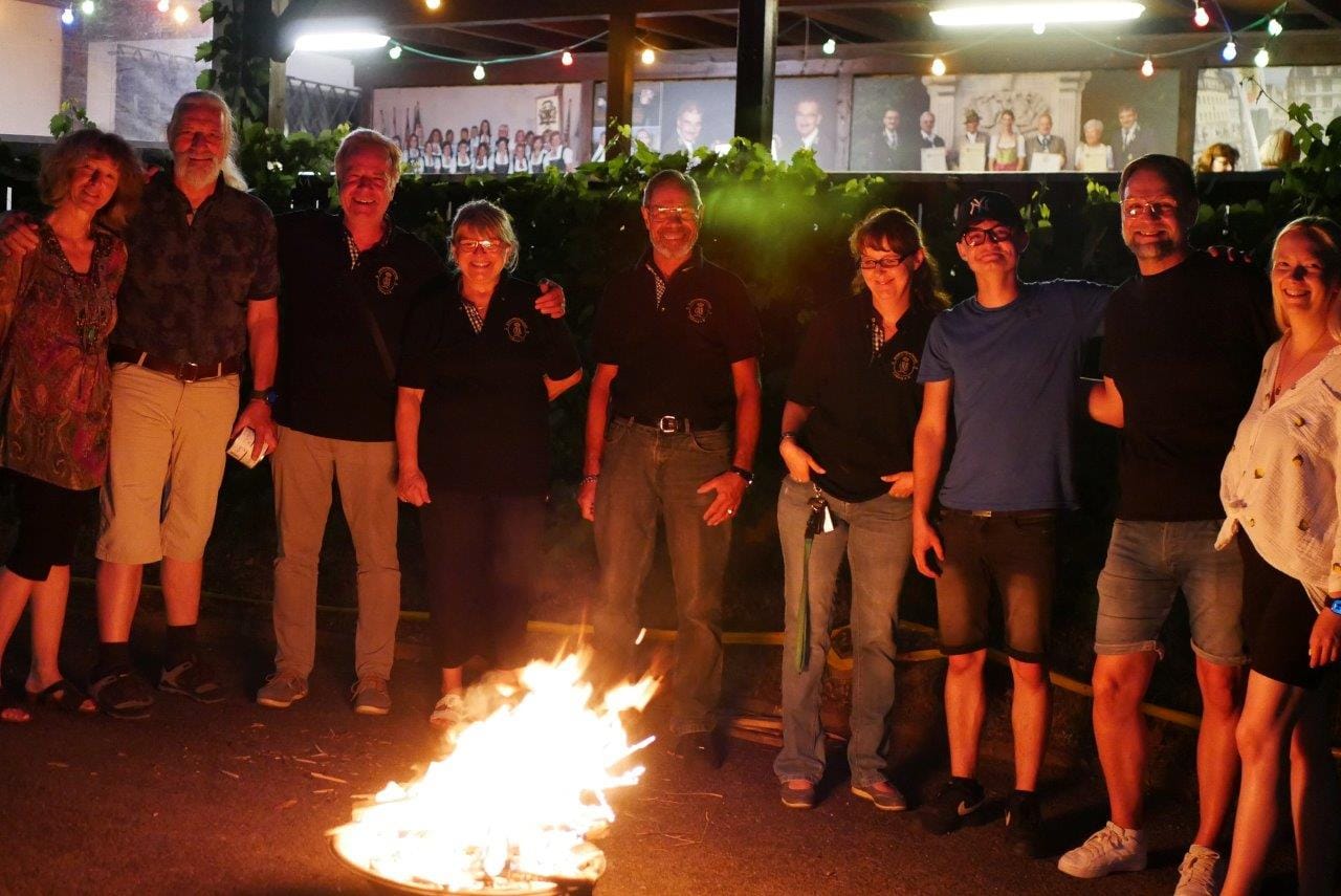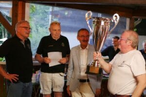 Mai holt sich den Pokal im Juni Unser traditionelles Sommeranfangsschießen feierten wir heuer erstmals mit unseren Hundefreunden zusammen auf unserem Gelände im Weichengereuth – denn zeitgleich fand der „Coburger Bratwurst-Cup 3.0“ vom SV OG Coburg statt. Natürlich ging es nicht nur feucht fröhlich, sondern auch sportlich hoch her, denn es galt den Hans-Herbert-Hartan Wander Pokal wieder zu erringen, den unser Schützenbruder und 2. Bürgermeister im vergangenen Jahr stiftete. Unser Archivar Andreas Mai holte sich die unübersehbare Trophäe, ihm dicht auf den Fersen Herbert Heerdegen und auf dem dritten Platz Ilona Rüll. Wolfgang Höll sicherte sich den 4. Platz. Zwar hatten wir die Genehmigung für unser Sonnwendfeuer, jedoch machte uns ein Erdwespennest im Aufbau einen Strich durch dir Rechnung. So zauberte unser Jungschütze Nino uns ein Sonnwendfeuer auf kleiner aber feiner Flamme.